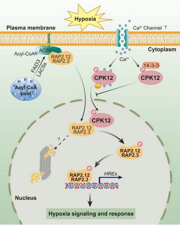研究表明,低氧誘導植物中多不飽和酰基輔酶A(C18:3-CoA)積累,且C18:3-CoA作為關鍵脂質信號分子介導ERF-VII與膜錨定蛋白ACBPs的解離和向核轉移,調控植物低氧應答,而CPK12對ERF-VIIs穩定性的調控作用則依賴于ACBPs介導的C18:3-CoA信號。進一步研究發現,磷脂酸PA與CPK12高親和度結合,誘導CPK12在低氧下的核質易位。相反,14-3-3蛋白則通過與磷酸化CPK12互作,抑制CPK12入核,從而負調控ERF-VIIs介導的低氧信號轉導(圖2)。該研究首次揭示了CPK12-ERF-VII功能模塊調控植物低氧感知與信號轉導的分子機理,并發現了鈣信號由細胞質到細胞核的轉導新機制,研究成果對深入理解植物逆境信號應答的調控網絡具有重要意義。