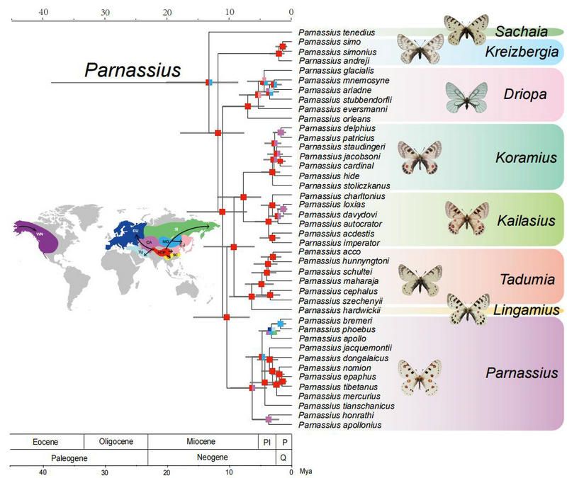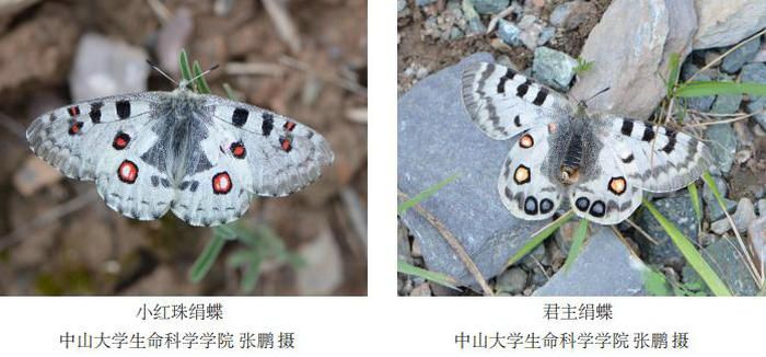 中大新聞網訊(通訊員梁丹)絹蝶是一種生活在高海拔山區的蝴蝶,以其翅膀形狀酷似半透明的薄絹而得名。其潔白色翅膀上常綴有亮紅色、橙色、藍色的圓斑(見圖1),外觀典雅高貴。絹蝶隸屬于鳳蝶科、絹蝶亞科、絹蝶屬,廣泛分布于歐亞大陸及北美洲,包括55種。該類群中許多物種如君主絹蝶和阿波羅絹蝶都是國家二級保護動物。絹蝶屬內的大部分物種能夠適應寒冷和高海拔的山地環境,有些物種活動的最高極限可達海拔6000米。因此,它們被譽為“雪線上飛舞的精靈”,是研究昆蟲高海拔適應的良好模型。雖然絹蝶屬是一個典型的高海拔分布類群,但其中也有少數物種生活在低海拔地區。學界對于該屬的起源存在爭議,一說是起源于高海拔環境,隨后部分物種逐漸往低海拔地區遷移,另一說是起源于低海拔環境,隨后逐漸適應高海拔山區。此外,絹蝶物種的幼蟲以許多不同科的植物為食,而且大多數種類是專食性的。絹蝶物種與其植物宿主的共同演化過程以及與其物種多樣性分化的關系也是值得研究的問題。一個穩健的絹蝶物種系統進化框架是開展相關研究的基礎,然而以往研究重建的絹蝶物種的系統發育關系相當不穩定,一些重要的節點,特別是基部支系仍有爭議。
