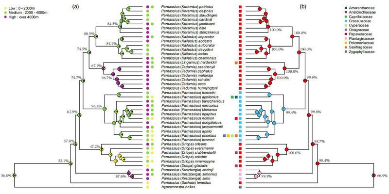 圖3 絹蝶海拔分布(a)和寄主植物(b)演化圖