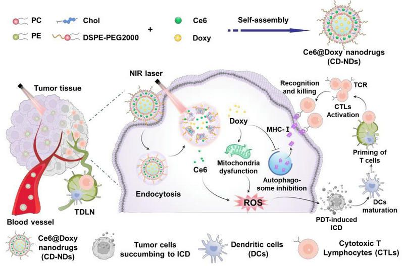 因此,本研究制備了一種脂質體納米藥物,共遞送抗生素鹽酸多西環素(Doxy)和光敏劑二氫卟吩e6(Ce6),實現腫瘤高效的光動力/免疫聯合治療。Doxy是一種常用抗生素,最新研究發現其還具有抗腫瘤作用。團隊的研究進一步發現Doxy可以抑制自噬并誘導線粒體功能障礙。光敏劑Ce6在近紅外(NIR)激光照射下,發揮光動力治療作用,并誘導腫瘤細胞發生ICD,逆轉“冷腫瘤”三陰乳腺癌的免疫抑制微環境。而Doxy會誘導線粒體功能障礙,增強光動力治療效果;同時,Doxy也會抑制腫瘤細胞的自噬活性,從而提高腫瘤細胞表面MHC-I的表達,促進腫瘤抗原的呈遞和CTLs的識別,從而提高腫瘤的免疫原性。通過聯合Ce6介導的光動力治療與Doxy誘導的自噬抑制和線粒體功能障礙,實現三陰乳腺癌的高效治療。本研究所開發的納米藥物顯示出良好的抗腫瘤效果,為改善“冷腫瘤”的免疫治療提供了一種高效的策略。