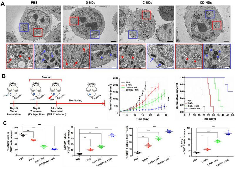 圖2、(A)乳腺癌腫瘤細胞接受不同納米藥物處理后的電鏡圖像。紅色線框放大圖顯示胞內自噬情況,紅色實線箭頭表示自噬小體,紅色箭頭表示自噬溶酶體;藍色線框放大圖顯示胞內線粒體情況,藍色實線箭頭表示正常線粒體,藍色箭頭表示受損線粒體。(B)納米藥物在乳腺癌腫瘤模型中的治療方案示意圖及不同納米藥物治療小鼠的平均腫瘤生長曲線和小鼠生存率。(C)通過流式細胞術檢測腫瘤組織中的M1型巨噬細胞、TAMs、CTLs和效應T淋巴細胞驗證納米藥物治療后抗腫瘤免疫激活情況。