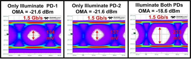 圖2:(a)與(b)分別為單探測器接收信號的眼圖;(c)為雙探測器接收信號的眼圖。