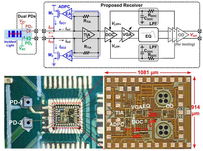 圖1:采用自適應直流光電流消除技術的新型差分雙探測器光接收前端架構及芯片。