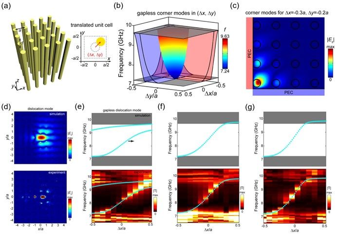 為解決這一難題,董建文教授團(tuán)隊(duì)通過(guò)在更高維度的空間中重新審視已有工作,研究發(fā)現(xiàn):過(guò)去人們習(xí)慣于在動(dòng)量空間中去實(shí)現(xiàn)和討論拓?fù)涔庾泳w,但是動(dòng)量空間的維度一般與實(shí)空間的維度保持一致,這極大地阻礙了人們對(duì)高緯度空間的拓?fù)淠J降奶剿鳌J艿胶铣删S度物理和四維量子霍爾效應(yīng)的啟發(fā),董建文教授團(tuán)隊(duì)通過(guò)引入兩個(gè)額外的合成平移維度,并結(jié)合二個(gè)動(dòng)量維度構(gòu)建了四維空間的第二陳晶體(如圖1(a)所示)。不同于二維空間中的第一陳數(shù),表征四維空間中晶體拓?fù)鋵傩缘耐負(fù)洳蛔兞渴堑诙悢?shù)。通過(guò)嚴(yán)格公式推導(dǎo)和詳細(xì)數(shù)值計(jì)算,他們發(fā)現(xiàn)該四維合成空間中每條獨(dú)立能帶的第二陳數(shù)恒等于1,證實(shí)了這種第二陳晶體的內(nèi)稟非平庸拓?fù)鋵傩浴_M(jìn)一步地,當(dāng)對(duì)四維合成平移空間中的第二陳晶體進(jìn)行維度截?cái)鄷r(shí)可以獲得局域在相應(yīng)低維邊界處拓?fù)淠J健L貏e地,當(dāng)同時(shí)在兩個(gè)周期方向上用PEC邊界去進(jìn)行維度截?cái)鄷r(shí),可以觀察到:局域在角落處的無(wú)帶隙拓?fù)浣悄#ㄈ鐖D1(b)(c)所示)。值得注意的是,這種無(wú)帶隙拓?fù)浣悄5拇嬖诓灰蕾?lài)于晶體對(duì)稱(chēng),因此提供了在任意晶體結(jié)構(gòu)中實(shí)現(xiàn)光場(chǎng)局域的設(shè)計(jì)方案。同時(shí)角模頻率覆蓋整個(gè)光子禁帶頻率范圍,這對(duì)于靈活地設(shè)計(jì)拓?fù)涔庾悠骷瑯又匾蛇x擇性設(shè)計(jì)微腔的響應(yīng)頻率。此外,位錯(cuò)是一種常見(jiàn)的實(shí)空間晶體缺陷,同樣可以實(shí)現(xiàn)光場(chǎng)局域,支持局域模場(chǎng)。研究團(tuán)隊(duì)通過(guò)維度壓縮將四維空間投影到一維空間,揭示了頻率覆蓋整個(gè)禁帶的一維拓?fù)湮诲e(cuò)模。具體地,先固定每個(gè)原胞內(nèi)圓柱的橫向平移量Δx,然后建立縱向平移量Δy與方位角θ的線性關(guān)系后,可以得到由伯格斯矢量標(biāo)定的位錯(cuò)結(jié)構(gòu),能夠在不依靠PEC邊界的情況下實(shí)現(xiàn)光場(chǎng)局域(如圖1(d)所示)。進(jìn)一步,這種拓?fù)湮诲e(cuò)模遍歷所有Δx參數(shù)后可以重建出一維渦旋線模式(如圖1(e)所示)。需要特別指出,這種拓?fù)湮诲e(cuò)模式在引入額外的缺陷后仍然存在,證明了其對(duì)各類(lèi)擾動(dòng)持有魯棒性(如圖1(f)(g)所示)。