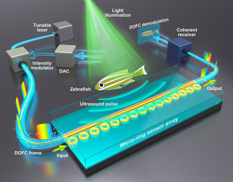 基于上述積累,研究團隊研制出包含15個微腔的超高靈敏度光學超聲傳感器陣列,該微環傳感器陣列具有高靈敏度、大帶寬和小尺寸等優點,其中單個微環傳感器具有175 MHz(-6 dB)的檢測帶寬和2.2?mPaHz?1/2的噪聲等效壓力,性能指標達到國際領先水平。基于可調的數字光頻梳技術,該研究團隊還研發了一套可與微環傳感器陣列相匹配的高性能并行信號檢測方案,對高速動態粒子、靜態葉脈和活體斑馬魚等展示了光聲計算成像結果。