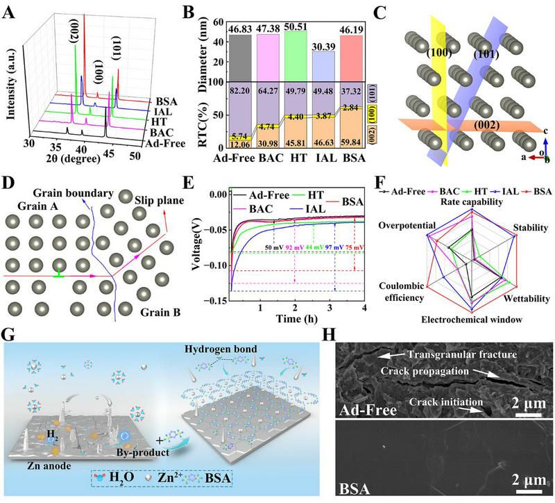 研究團(tuán)隊(duì)建立了具有不同配體的芳香有機(jī)分子數(shù)據(jù)庫,考察了23種電解液添加劑的分子結(jié)構(gòu)對(duì)“電極-電解液”界面性質(zhì)的影響,包含具有羧基、羥基、醛基和磺酸基官能團(tuán)的陰離子小分子。基于此,通過電化學(xué)測(cè)試研究了的分子結(jié)構(gòu)、電荷狀態(tài)和螯合基團(tuán)對(duì)金屬鋅化學(xué)機(jī)械穩(wěn)定性的影響。測(cè)試結(jié)果表明,羧基和羥基配體對(duì)金屬鋅具有更強(qiáng)的化學(xué)吸附能力,引入螯合基團(tuán)有助于基于添加劑Zn2+配位的高效溶劑化。此外,醛基和磺酸基配體由于其親油性性質(zhì)促進(jìn)(002)平面的織構(gòu)生長,磺酸分子由于其大的極性表面和設(shè)計(jì)的結(jié)構(gòu)沉積物而提供了優(yōu)秀的綜合性能。添加的Zn2+復(fù)合物沉積產(chǎn)生了具有濃度梯度的保護(hù)層,從而阻礙了氧化應(yīng)力引起的裂紋擴(kuò)展。Zn//Zn穩(wěn)定性測(cè)試表明,磺酸鹽添加劑在2 mA cm-2和1 mAh cm?2下的使用壽命從50次提高到3000次。研究結(jié)果為設(shè)計(jì)與開發(fā)先進(jìn)水性儲(chǔ)能電解液體系開辟了新的策略。