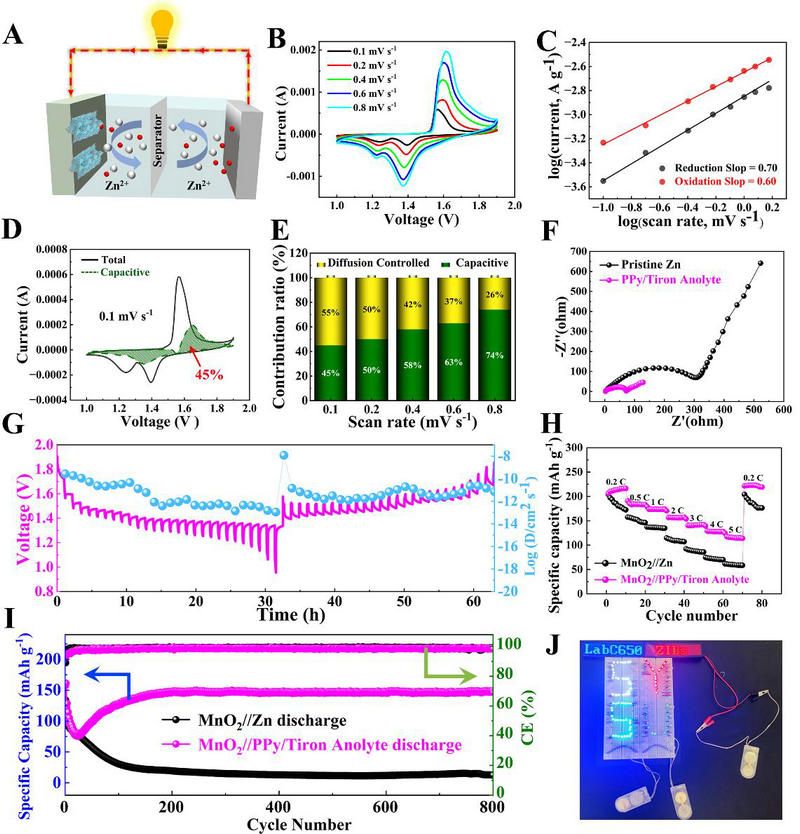 相關(guān)研究結(jié)果以“Overcoming Obstacles in Zn-ion Batteries Development: Application of Conductive Redox-active Polypyrrole/Tiron Anolyte Interphase”為題發(fā)表在Advanced Functional Materials上,中山大學(xué)材料科學(xué)與工程學(xué)院2020級(jí)碩士生羅鳴武是論文第一作者,2021級(jí)碩士生甘雄日、2021級(jí)本科生章陳然為共同作者,中山大學(xué)材料科學(xué)與工程學(xué)院為論文第一完成單位,石鎧源副教授為論文末位通訊(唯一)作者。
