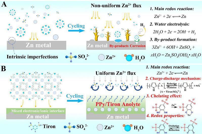 課題組提出了一種電荷轉(zhuǎn)移型人工固體電解質(zhì)保護(hù)層的制備方法,利用陽極電解液添加劑(Anolyte)的氧化還原作用提升保護(hù)界面的電化學(xué)性能。電荷轉(zhuǎn)移型固體界面由帶正電的聚吡咯和帶負(fù)電的1,2-二羥基苯 -3,5-二磺酸鈉(Tiron)所構(gòu)成,通過優(yōu)化混合導(dǎo)電界面層的結(jié)構(gòu)形貌特性用于修飾鋅負(fù)極。研究對(duì)比了化學(xué)聚合和電化學(xué)聚合法制備保護(hù)界面,分析了有/無摻雜劑和摻雜劑濃度對(duì)合成材料形貌、粒徑大小及分布的影響。結(jié)果表明,酚羥基官能團(tuán)提高了聚吡咯與基底之間的螯合作用,同時(shí)促進(jìn)了電解液的氧化還原反應(yīng)。 此外,引入磺酸根能夠重塑硫酸鋅中[Zn(H2O)6]2+的溶劑化殼結(jié)構(gòu),減弱水分子的電化學(xué)活性。在“充電-放電” 過程中,電荷轉(zhuǎn)移型固體界面通過聚吡咯的摻雜/去摻雜行為促進(jìn) 了Tiron 在電極表面的吸附/解吸,外加電場(chǎng)導(dǎo)致了“Zn2+-Tiron”絡(luò)合物的氧化,生成的中間產(chǎn)物釋放出金屬離子,利用苯酚到苯醌的相互轉(zhuǎn)化,增強(qiáng)了“電極-電解液”之間的電荷轉(zhuǎn)移。