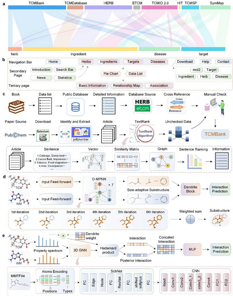 2023年,中山大學(xué)智能工程學(xué)院陳語(yǔ)謙教授團(tuán)隊(duì)在Signal Transduction and Targeted Therapy (影響因子39.3) 期刊發(fā)表了題目為“TCMBank-the largest TCM database provides deep learning-based Chinese-Western medicine exclusion prediction”的論文。該研究建立了中醫(yī)藥數(shù)據(jù)庫(kù)TCMBank(https://TCMBank.CN/),該數(shù)據(jù)庫(kù)提供了9192種草藥,61,966種成分,15,179個(gè)靶標(biāo),32,529種疾病,及其它們之間的關(guān)聯(lián)信息。