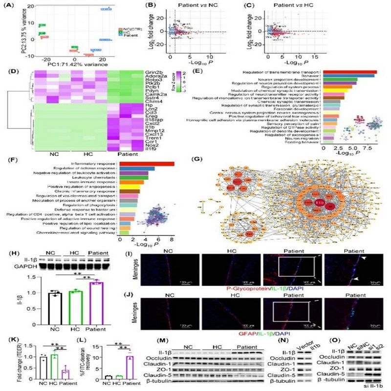 該研究進一步發現,PBMC通過上調BBB內皮細胞IL-1β表達以促進BBB的破壞。研究人員通過轉錄組學、免疫熒光、蛋白印跡等鑒定了PBMC通過上調IL-1β介導模型小鼠BBB破壞(圖3A-J),并在體外BBB模型中對內皮細胞 Il-1β 進行敲除也發現敲除 Il-1β 后BBB破壞明顯減輕(圖3K-O)。