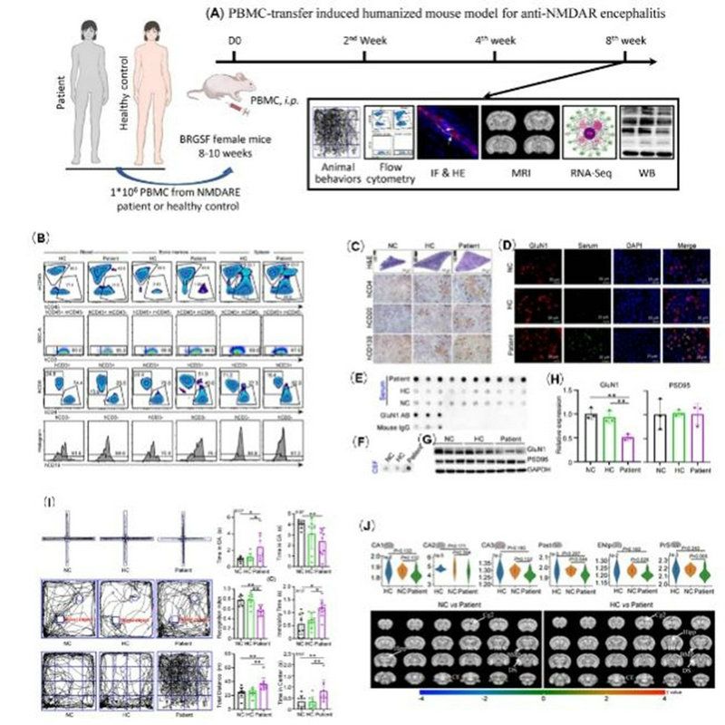 該研究首次構建了PBMC誘導的人源化小鼠模型:課題組分別將抗NMDAR腦炎患者、健康受試者的PBMC(外周血單核細胞)通過腹腔注射至重度免疫缺陷小鼠-BRGSF小鼠中(圖1A),人源的免疫細胞可以在小鼠的血、脾、骨髓中存活(圖1B),小鼠脾臟形成類似于生化中心的結構(圖1C)。而且,實驗模型小鼠的血、腦脊液中有抗NMDAR抗體(抗GLuN1抗體)產生(圖1D-F),模型小鼠腦組織中GLuN1表達下調(圖1G,H);進一步行為學檢測還發現模型小鼠精神行為存在異常(圖1I);通過9T功能MRI成像也顯示實驗模型小鼠腦功能紊亂和腦結構輕度萎縮(圖1J)。
