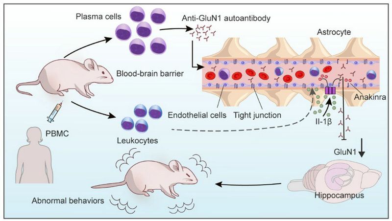 本研究首次構建了PBMC誘導的人源化抗NMDAR腦炎小鼠模型,并進一步從體內、體外實驗揭示PBMC通過上調IL-1β促進BBB的破壞進而誘導模型小鼠腦炎發生。該研究不僅闡明了抗NMDAR腦炎潛在的發病機制,也為抗NMDAR腦炎的精準治療提供了新的靶點,并為下一步開展Anakinra藥物臨床試驗奠定了理論基礎。