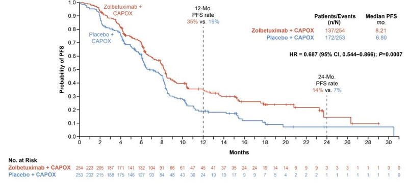 GLOW研究結果顯示,與安慰劑+CAPOX組相比,Zolbetuximab+CAPOX組的PFS顯著提升,治療組和安慰劑組的中位PFS分別為8.21個月(95%CI:7.46–8.84)和6.80個月(95%CI:6.14–8.08),疾病進展或死亡風險降低了31.3%(HR=0.687;P=0.0007),達到了主要終點。