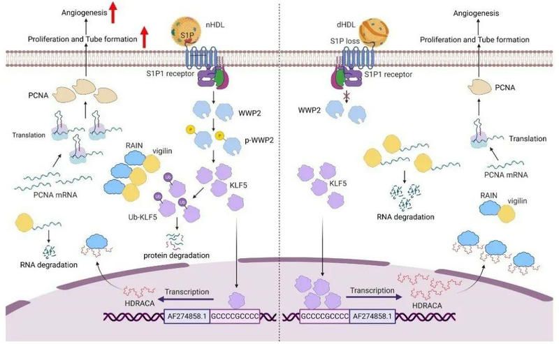團隊首先通過對lncRNA測序結果分析篩選,發現HDRACA可調節血管內皮細胞的增殖和管狀形成,并確定了HDRACA是定位于內皮細胞漿中的長度553nt的無蛋白編碼能力的lncRNA。進一步實驗證實,nHDL可降低血管內皮細胞中的HDRACA表達,而dHDL對HDRACA表達的降低作用明顯減弱。通過一系列分子實驗發現,nHDL攜帶的S1P可與血管內皮細胞的S1P1相互作用誘導WWP2泛素連接酶磷酸化激活,催化HDRACA的轉錄因子KLF5泛素化降解,抑制HDRACA的轉錄。而dHDL攜帶的S1P含量明顯減少,導致dHDL對HDRACA表達的抑制作用明顯減弱。進一步實驗證實nHDL抑制血管內皮細胞的HDRACA表達可促進血管新生,而dHDL對HDRACA表達的抑制明顯減弱,導致它無法有效地促進血管新生。團隊還發現HDRACA可以結合重要的血管新生調節蛋白RAIN,抑制RAIN和Vigilin的相互作用,進一步促進Vigilin誘導PCNA的mRNA不穩定降解,從而抑制PCNA的表達。nHDL通過抑制HDRACA表達影響RAIN-Vigilin-PCNA相互作用,促進PCNA的表達而促進血管新生。而dHDL無法有效地抑制HDRACA的表達,導致PCNA的表達減少,無法促進血管新生。