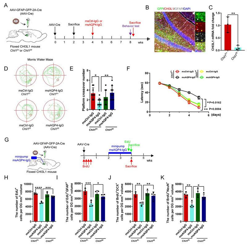 特異性敲除星形膠質細胞中CHI3L1,可改善NMOSD模型小鼠海馬神經發生缺陷及認知功能障礙:本研究進一步應用Chil1flox/flox小鼠,特異性敲除星形膠質細胞中CHI3L1,能夠挽救NMOSD動物模型的海馬神經發生缺陷及認知功能障礙(圖4)。