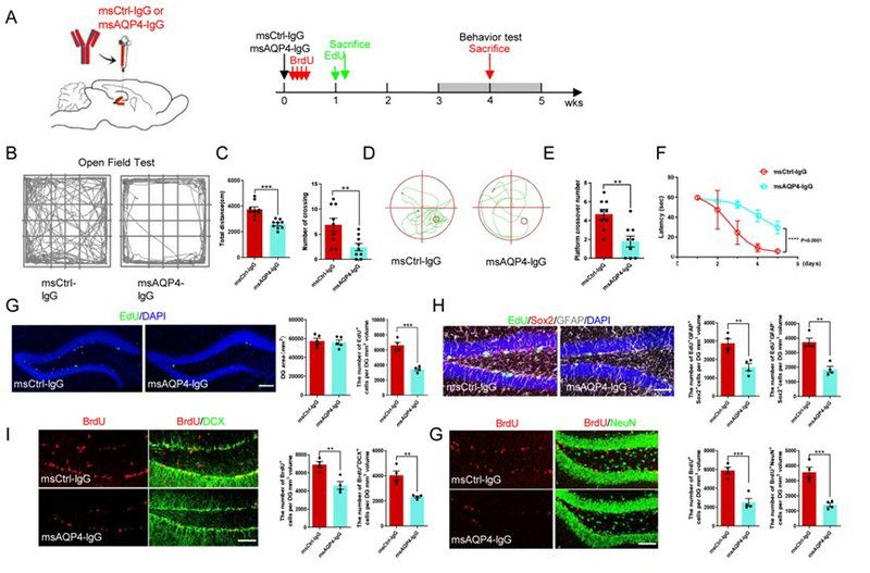 注射AQP4-IgG導致成體神經發生缺陷及認知功能障礙:團隊利用腦立體定位注射技術向海馬注射AQP4-IgG ,4周后進行相關行為學實驗。曠場實驗中,注射AQP4-IgG組小鼠運動總路程及中央區域跨越次數均減少;在莫里斯水迷宮(MWM)中,AQP4-IgG組小鼠穿越目標象限的次數減少,尋找到平臺所用時間更長。團隊進一步將這些小鼠腦冰凍切片進行免疫熒光染色,發現EdU+增殖細胞、EdU+GFAP+Sox2+ 神經干細胞和EdU+GFAP-Sox2+ 前體細胞、BrdU+DCX+未成熟神經元和BrdU+NeuN+成熟神經元的細胞數量均較對照組減少(圖3)。