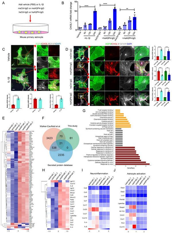 AQP4-IgG刺激星形膠質細胞釋放多種炎癥因子:該研究首先利用RT-qPCR驗證了AQP4抗體(AQP4-IgG)可以誘導星形膠質細胞增加CHI3L1的表達。通過免疫熒光染色,進一步闡明了AQP4抗體可激活星形膠質細胞CHI3L1的表達,并導致AQP4表達降低及內化。轉錄組測序分析發現,AQP4-IgG刺激星形膠質細胞分泌大量的炎癥因子(包括CHI3L1)(圖1)。