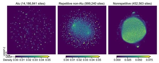 傳統的motifs 搜索工具通常僅適用于小規模數據集,而iMVP通過引入UMAP和HDBSCAN技術,并且通過使用GPU加速,成功應對了處理極大RNA修飾位點數據集的挑戰。研究團隊使用iMVP工具進行了對包含1500萬個A-to-I RNA編輯位點進行分析。他們觀察到不同類型的A-to- I RNA編輯位點在Alu、非Alu重復和非重復區域中呈現出截然不同的模式。進一步應用iMVP工具,他們獲得了高分辨率的數據結果,成功識別出各類編輯位點的簇群。
