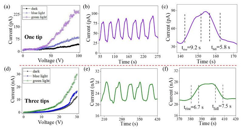 圖3: (a, d) 單層WS2單針尖或三針尖器件在不同輻照條件下的I-V曲線;(b、e) 單層WS2單針尖或三針尖器件在綠光照射下的光響應曲線;(c、f) 相應提取的上升和下降光響應曲線