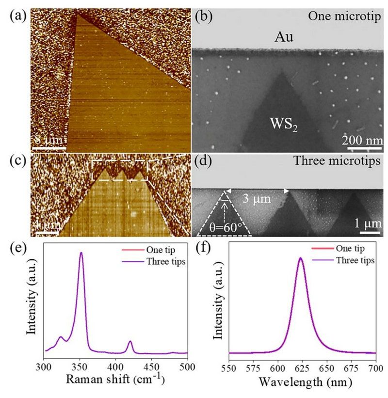 圖1: (a,b) 單層WS2微針尖平面場發射器件的AFM和SEM圖;(c,d) 三針尖器件的AFM和SEM圖。其中白色虛線給出了針尖位置,三個針尖的頂角均約為60°;(e,f) WS2單針尖或三針尖的拉曼光譜和熒光光譜