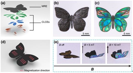 除了多色打印,多墨水打印技術(shù)還使結(jié)構(gòu)色材料與多功能材料的集成式打印成為可能。該課題組將結(jié)構(gòu)色材料打印的任意圖案作為仿生表層引入至仿生機(jī)器人中,一體式打印了基于多層結(jié)構(gòu)的仿生柔性機(jī)器人。該仿生機(jī)器人以磁響應(yīng)彈性體為致動層,模仿蝴蝶的無束縛運(yùn)動能力;并以膽甾相液晶彈性體為表面仿生著色層,模仿蝴蝶的結(jié)構(gòu)色外觀。如圖3所示,一體式墨水直寫打印的仿生蝴蝶擁有美麗而逼真的外形,而在外加磁場作用下可生動地“撲動”翅膀,有極高的仿生度,體現(xiàn)了這種打印策略在新一代仿生機(jī)器人及其他更多可打印系統(tǒng)中的應(yīng)用潛力。此外,打印的結(jié)構(gòu)色液晶彈性體還具有熱響應(yīng)性,加熱即可發(fā)生定向形變,呈現(xiàn)出4D打印效果。未來可在仿生機(jī)器人、信息存儲、柔性傳感和信號檢測方面得到應(yīng)用。