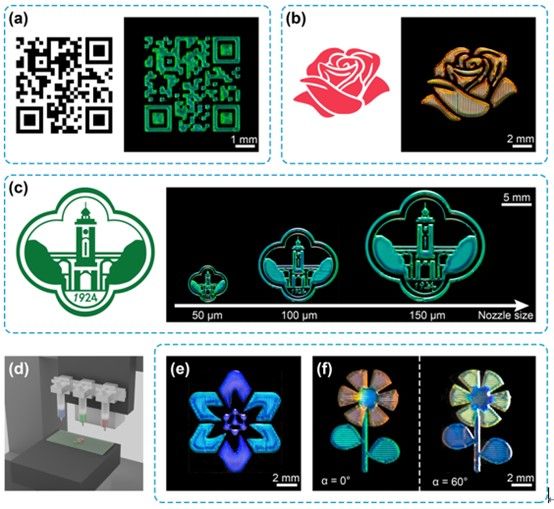 基于對分辨率和顏色的良好控制,可以實(shí)現(xiàn)對復(fù)雜設(shè)計圖案的高還原度打印。針對不同圖案的尺寸特點(diǎn)選取恰當(dāng)?shù)姆直媛剩瑒t可實(shí)現(xiàn)對同一圖案的縮放式打印。此外,多材料墨水直寫3D打印系統(tǒng)對多墨水打印技術(shù)的支持使不同顏色的墨水能在一個打印過程中依次打印,實(shí)現(xiàn)彩色圖案的快速制造(圖2)。
