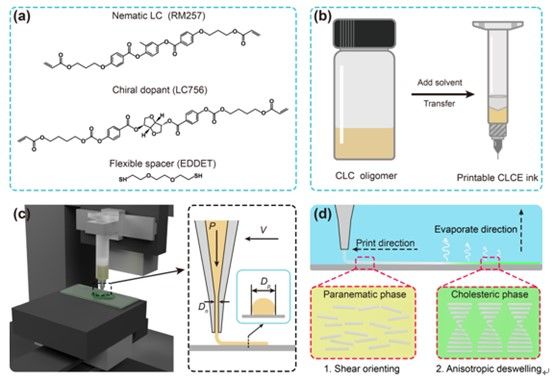 該課題組以向列相液晶RM 267、手性摻雜劑LC 756和擴(kuò)鏈劑EDDET為原料通過邁克爾加成反應(yīng)制備了具有光敏活性的膽甾相液晶彈性體低聚物,并添加二氯甲烷作為稀釋劑制備了可打印墨水。通過探究墨水直寫打印過程中打印速度、打印壓力及針頭直徑對打印墨水細(xì)絲直徑的影響,構(gòu)建數(shù)學(xué)關(guān)系,實(shí)現(xiàn)了在大范圍內(nèi)(52.54~436.27 μm)對打印分辨率的高度控制。直寫打印過程中,在墨水通過針尖擠出過程所受到的剪切力及打印后溶劑各向異性揮發(fā)的共同作用下,液晶分子自組裝形成螺旋有序結(jié)構(gòu)(圖1),使墨水細(xì)絲表現(xiàn)出鮮艷的結(jié)構(gòu)色,進(jìn)一步經(jīng)光照固化之后顏色可以長期保存。