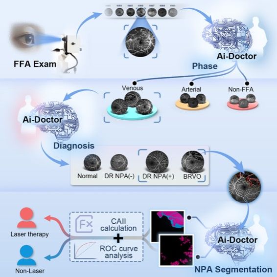 為此,中山大學中山眼科中心林浩添教授等人聯合多中心機構,基于熒光素眼底血管造影檢查,研發了集成圖像分期、疾病診斷、病灶分割及量化分析以及治療決策建議等系列功能的智能輔助系統Ai-Doctor。