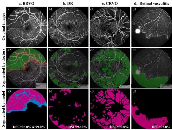 圖2. 常見缺血性視網膜疾病缺血區的自動分割