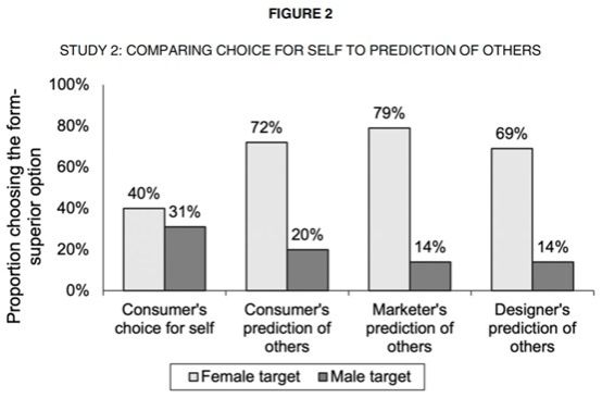 為了檢驗(yàn)上述假設(shè),作者進(jìn)行了七項(xiàng)實(shí)驗(yàn)和四個(gè)后續(xù)實(shí)驗(yàn)。研究發(fā)現(xiàn)在面對產(chǎn)品外形和功能權(quán)衡時(shí),人們?yōu)樗撕蜑樽约鹤鞒龅漠a(chǎn)品決策存在顯著的不一致(實(shí)驗(yàn)1、2、5A、5B),即人們更傾向于為女性他人(vs.男性他人)選擇外形優(yōu)越(vs.功能優(yōu)越)產(chǎn)品,但為自己選擇時(shí)則無性別差異,這個(gè)結(jié)論不僅適用普通消費(fèi)者(實(shí)驗(yàn)1、2、5A、5B、后續(xù)實(shí)驗(yàn)1)還適用于市場營銷人員及產(chǎn)品設(shè)計(jì)人員(實(shí)驗(yàn)2,如下圖)。