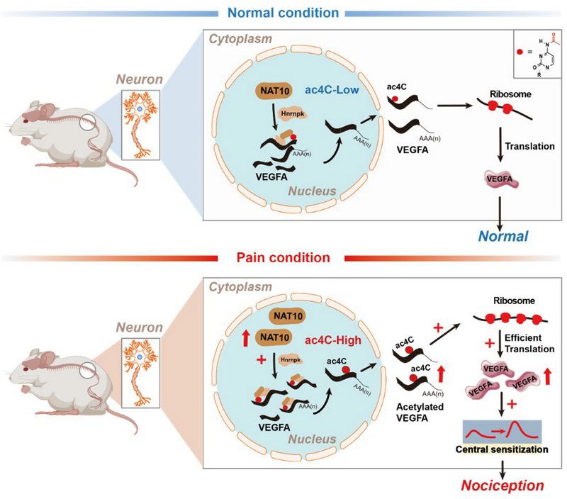 科學假說模式圖:ac4C修飾酶NAT10介導的VEGFA表達上調參與神經病理性疼痛的機制