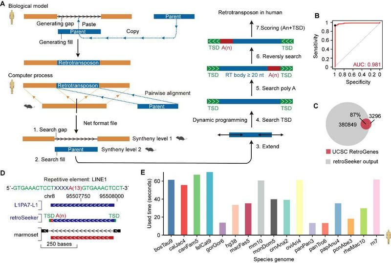近日,中山大學生命科學學院楊建華/屈良鵠教授團隊開發了在全基因組檢測逆轉錄轉座子的新計算方法retroSeeker。通過將逆轉錄轉座子事件的生物學模型(復制-粘貼)映射到比較基因組學數據(gap和fill)中,retroSeeker算法能夠準確地識別任何物種基因組中的新逆轉錄轉座子。具體而言,親本基因的存在產生了一個“填充”(fill)區域,而“復制-粘貼”過程則在新的基因座產生了一個“間隙”(gap)區域,通過將物種間的基因組進行兩兩比對,可以復現這些“填充”和“間隙”區域以獲得候選的轉座子區域 (圖1A)。此外,根據逆轉錄轉座的TPRT(target-site primed reverse transcription)機制,逆轉錄轉座子的復制往往還需要借助其poly(A) 尾巴,且在插入新基因座后,逆轉錄轉座子兩側還會形成標志性的TSD(target site duplications)序列。因此,一旦retroSeeker確定了潛在的逆轉錄區域,它會立即利用動態規劃算法對側翼的TSD和poly(A)序列進行搜索和評分,最終獲得高置信度的逆轉錄轉座子候選 (圖1A)。通過模擬數據和真實數據的測試,retroSeeker算法表現出高度特異性、高靈敏度和快速的運行速度。(圖1B-E)。