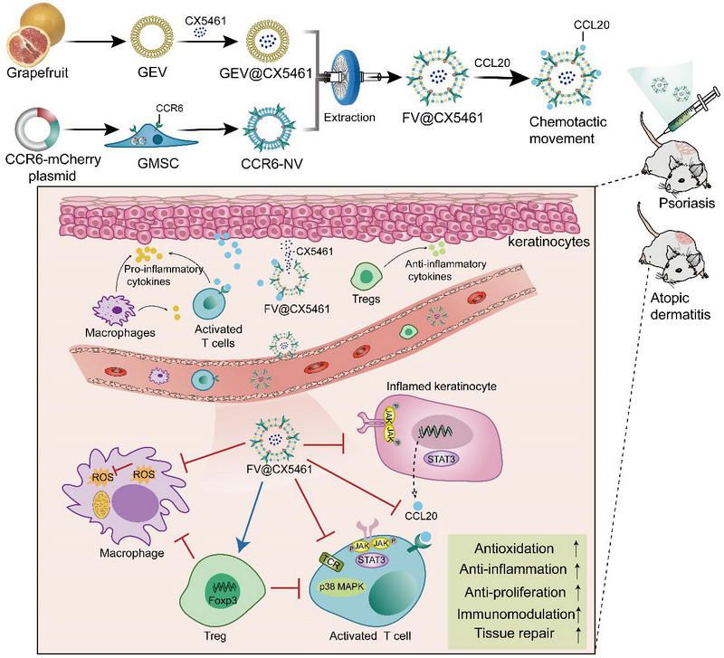 本研究首次探索了CX5461對銀屑病和特應性皮炎的治療作用,將其適應癥拓寬到自身免疫病領域,并創新性地設計了載藥融合囊泡,提供了一種基于生物材料的藥物遞送新策略。研究團隊表示,植物外泌體樣納米囊泡不僅可以作為藥物遞送載體,還可以作為治療劑,通過所含的脂質、天然代謝物和核酸發揮協同作用。各類植物來源的外泌體樣納米囊泡可以通過與天然/工程化修飾的細胞膜囊泡融合來實現功能優化,細胞膜囊泡的來源也可以多樣化。該策略為探索中草藥外泌體作為下一代植物藥在慢性炎癥性疾病的應用提供依據,還將對提高中草藥中新型有效成分的提取、吸收、利用有重要意義,或成為中藥現代化和標準化的一個突破口,未來在開發新型“綠色”治療藥物和大健康產品等領域具有廣闊的應用前景。