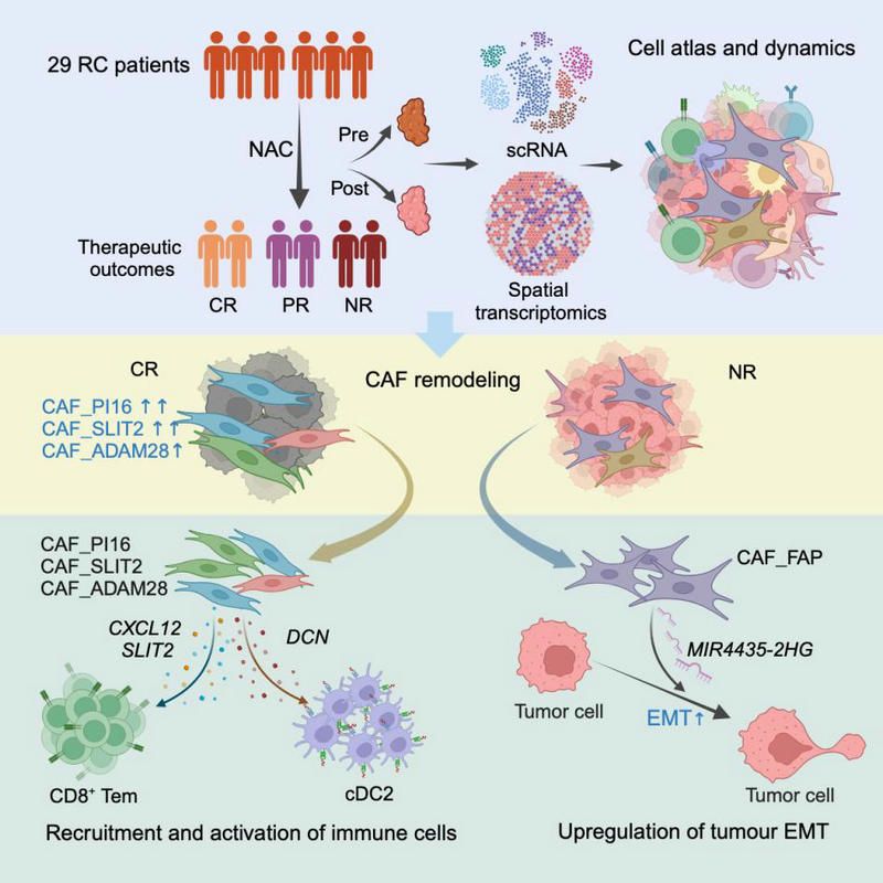考慮到上述問題,任東林、林宏城團隊招募了29例直腸癌患者,在新輔助化療前后分別取樣,并對樣本進行了單細胞轉錄組測序和空間轉錄組測序。研究團隊根據療效將樣本分為CR(完全緩解)、PR(部分緩解)和NR(無明顯緩解)三個分組進行治療前后和不同療效之間的多維度分析,構建了腫瘤微環境在新輔助化療前后動態變化的細胞圖譜,實現腫瘤微環境如何影響新輔助化療療效的系統研究。