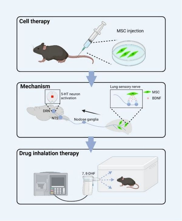 為了回答這一問題,中山大學中山醫(yī)學院項鵬教授和張小然副教授團隊開展研究,近日在Nature Communications上發(fā)表了題為“Mesenchymal stromal cells alleviate depressive and anxiety-like behaviors via a lung vagal-to-brain axis in male mice”的論文,研究揭示了MSC通過肺迷走傳入神經(jīng)→孤束核→中縫背核神經(jīng)通路發(fā)揮抗抑郁和抗焦慮作用。