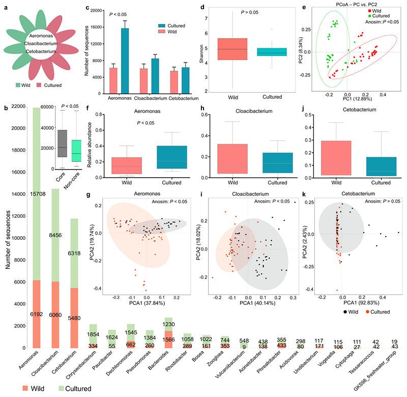 該研究揭示了以下重要發(fā)現(xiàn):(a) 野生和飼養(yǎng)的腹足綱動(dòng)物的腸道微生物群落存在顯著差異,不同的腹足綱動(dòng)物種類都存在腸道核心微生物Aeromonas、Cloacibacterium和Cetobacterium;(b) 在腹足綱動(dòng)物中,盡管水平傳遞占據(jù)了大部分腸道菌群的傳播比例,但約43%的腸道微生物可以在非無菌環(huán)境中通過垂直傳遞的方式遺傳給下一代;(c) 在非無菌條件下,野生腹足綱動(dòng)物的腸道微生物可以維持長(zhǎng)達(dá)2代,之后F3和F4代的腸道菌群的組成會(huì)逐漸與飼養(yǎng)的腹足綱動(dòng)物腸道菌群趨同;(d) 腸道菌群的趨同進(jìn)化可能有助于腹足綱動(dòng)物從野生環(huán)境到養(yǎng)殖環(huán)境的適應(yīng)性進(jìn)化,并且這一過程與代謝功能相關(guān);(e) 垂直傳遞而不是水平傳遞推動(dòng)了腸道菌群的趨同進(jìn)化,促進(jìn)宿主健康。這表明腸道微生物群落結(jié)構(gòu)的變化可以作為宿主健康水平或當(dāng)前狀態(tài)的潛在指標(biāo);(f) 發(fā)現(xiàn)核心微生物Aeromonas和Cloacibacterium不僅能夠跨多子代垂直傳遞,還可在宿主不同發(fā)育階段中縱向傳播,為腸道定植菌。