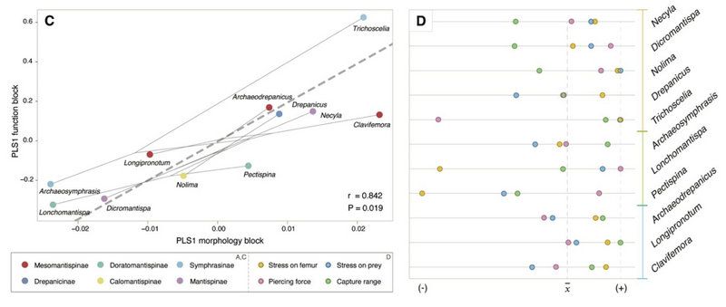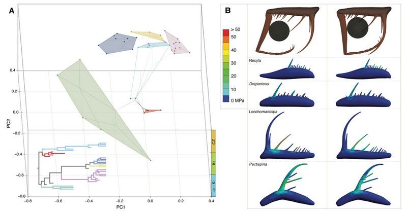 中大新聞網(wǎng)訊(通訊員師超凡)昆蟲在四億年的演化歷程中特化出多樣的捕食器官,并衍生出不同的捕食策略、取食對象及分異的生態(tài)位。捕捉足是其中十分具有代表性的一類捕食器官,在昆蟲綱中多次獨立起源。其中,脈翅目螳蛉科(Neuroptera: Mantispidae)的演化歷史最長,化石豐富,捕捉足多樣化程度高,為研究昆蟲捕食器官的功能形態(tài)學及其對支系演化的影響提供了范例。中山大學地球科學與工程學院師超凡副教授團隊結(jié)合支序?qū)W、幾何形態(tài)、力學建模分析和生態(tài)學的數(shù)據(jù)與方法對螳蛉捕捉足及其譜系多樣化歷史進行了研究。