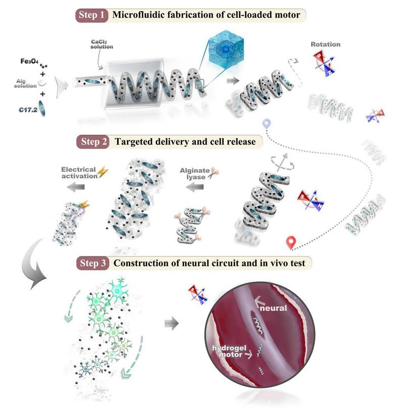該馬達選用海藻酸水凝膠材料為基底,通過毛細玻璃搭建的雙液相微流設備,制備了可降解的、生物相容性良好的螺旋支架,避免了使用細胞毒性材料,與此同時,該制備方法不需要繁瑣的程序、復雜的實驗裝置、高昂的費用和勞動力成本。此外,它還為細胞提供了多孔的三維網絡,用于氣體和營養交換。微納米馬達可高效地運輸多類細胞,同時負載所需的材料和生長因子,以加快修復過程。馬達在外部磁場操縱下實現了無線驅動,確保了神經干細胞精確交付到所需位置,該水凝膠支架也起到隔離層的作用,防止細胞直接暴露在微流體環境中或面臨免疫系統監視,最大限度地減少細胞損失并保持細胞功能。在目標位點,微納米馬達完成酶響應細胞釋放、增殖和細胞間信號通路的激活。來自微納米馬達的神經干細胞在維持其分化能力的同時,在體內建立神經元間的連接,通過電生理檢測與行為學觀察等,驗證了促進功能性神經細胞相互作用的修復。因此,該集成化微型馬達為指導神經干細胞再生和重建神經通路提供了一個綜合平臺,為解決神經退行性疾病和神經創傷等提供了一個潛在的解決方案。