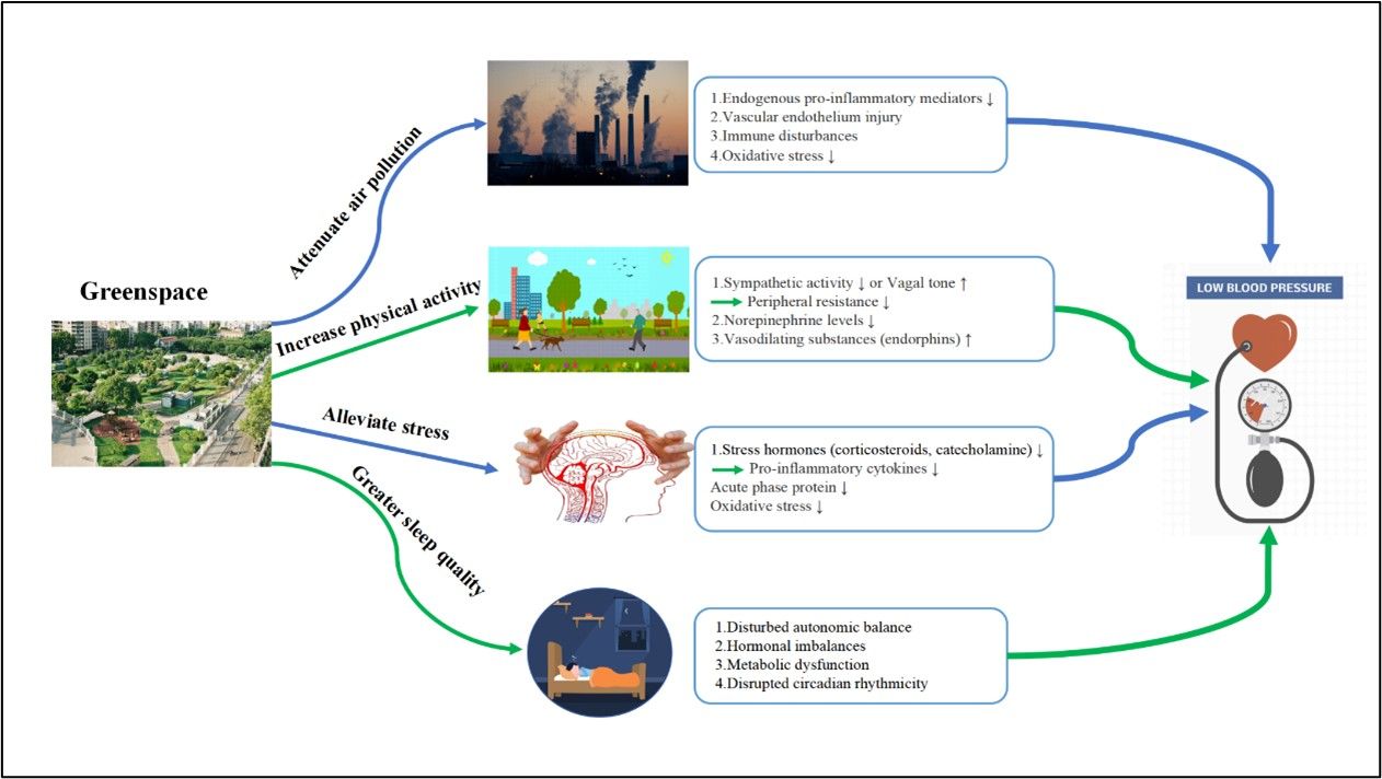 同時,團隊利用Meta分析的方法,對目前已發表的38篇有關綠地與血壓的研究論文進行了循證梳理,于Science of the Total Environment雜志發表題為“Association between greenspace and blood pressure: A systematic review and meta-analysis”的研究。研究結果表明,超65%的研究發現周圍環境中綠地暴露與血壓水平/高血壓之間的存在保護效應。此外,較高的綠地暴露水平與較低水平的收縮壓(SBP=-0.77mmHg,95%CI:-1.23至-0.32)和舒張壓(DBP=-0.32mmHg,95%CI:-0.57至-0.07)顯著相關。結合我們的系列研究成果,研究團隊構建了城市綠地影響兒童心血管健康的研究框架(如圖2所示)。