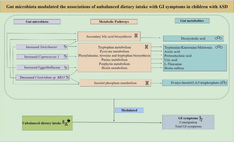 為解決上述問題,中山大學公共衛生學院婦幼衛生學系靜進教授和朱艷娜副教授團隊開展了相關研究,近日在Gut Microbes上發表了題為“Multi-omics analyses demonstrate the modulating role of gut microbiota on the associations of unbalanced dietary intake with gastrointestinal symptoms in children with autism spectrum disorder”的論文,該研究通過多組學方法揭示了腸道菌群在ASD兒童膳食不平衡與胃腸道癥狀之間關系的調節作用。