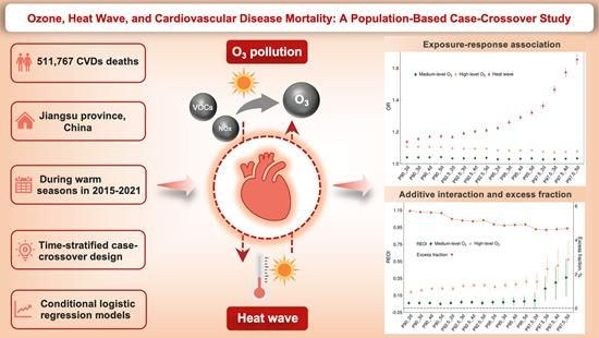 中大新聞網(wǎng)訊(通訊員許瑞君)作為夏季主要的大氣污染物之一,地面臭氧(O3)主要由揮發(fā)性有機(jī)化合物(VOCs)和氮氧化物(NOx)經(jīng)過光化學(xué)反應(yīng)轉(zhuǎn)化而形成,是造成我國(guó)區(qū)域大氣復(fù)合污染的重要因素之一。以持續(xù)高溫為特征的熱浪事件,在全球氣候變化背景下呈現(xiàn)出頻次高、強(qiáng)度大、持續(xù)時(shí)間長(zhǎng)等特點(diǎn),已成為全球關(guān)注的熱點(diǎn)環(huán)境問題。由于具有相近的氣象驅(qū)動(dòng)因素,O3污染和熱浪事件時(shí)常伴隨出現(xiàn)。盡管已有較多證據(jù)提示O3和熱浪暴露均與心血管健康有關(guān),但兩種因素復(fù)合暴露下的健康風(fēng)險(xiǎn)特征尚不明確。鑒于全球氣候變化背景下O3污染和高溫?zé)崂藦?fù)合暴露場(chǎng)景日趨頻繁,量化O3和熱浪對(duì)心血管疾病的協(xié)同影響具有重要的公共衛(wèi)生學(xué)意義。