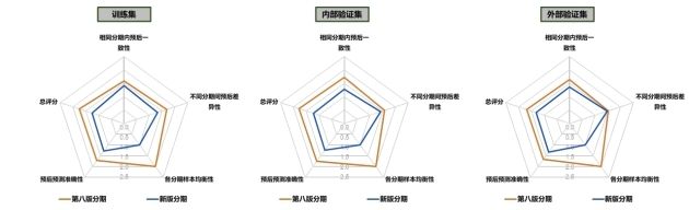 兩版分期在訓練集、內部和外部驗證集中的比較(數值越小表現越好)