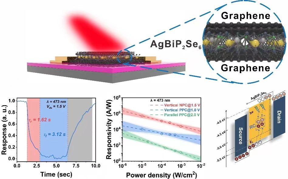 相關成果以“Giant Negative Photoresponse in van der Waals Graphene/AgBiP2Se6 /Graphene Trilayer Heterostructures”為題發表在國際材料頂級期刊Advanced Materials上(Advanced Materials, 2024, DOI:10.1002/adma.202312541),第一作者為何偉(材料科學與工程學院2020級碩士研究生)和伍棟(材料科學與工程學院2021級碩士研究生),通訊作者為于鵬副教授。材料科學與工程學院為論文唯一完成單位。楊國偉教授對本工作的完成給予了重要的指導。該研究工作受到國家重點研發計劃、國家自然科學基金、廣東省自然科學基金以及光電材料與技術國家重點實驗室重點培育基金的大力支持。