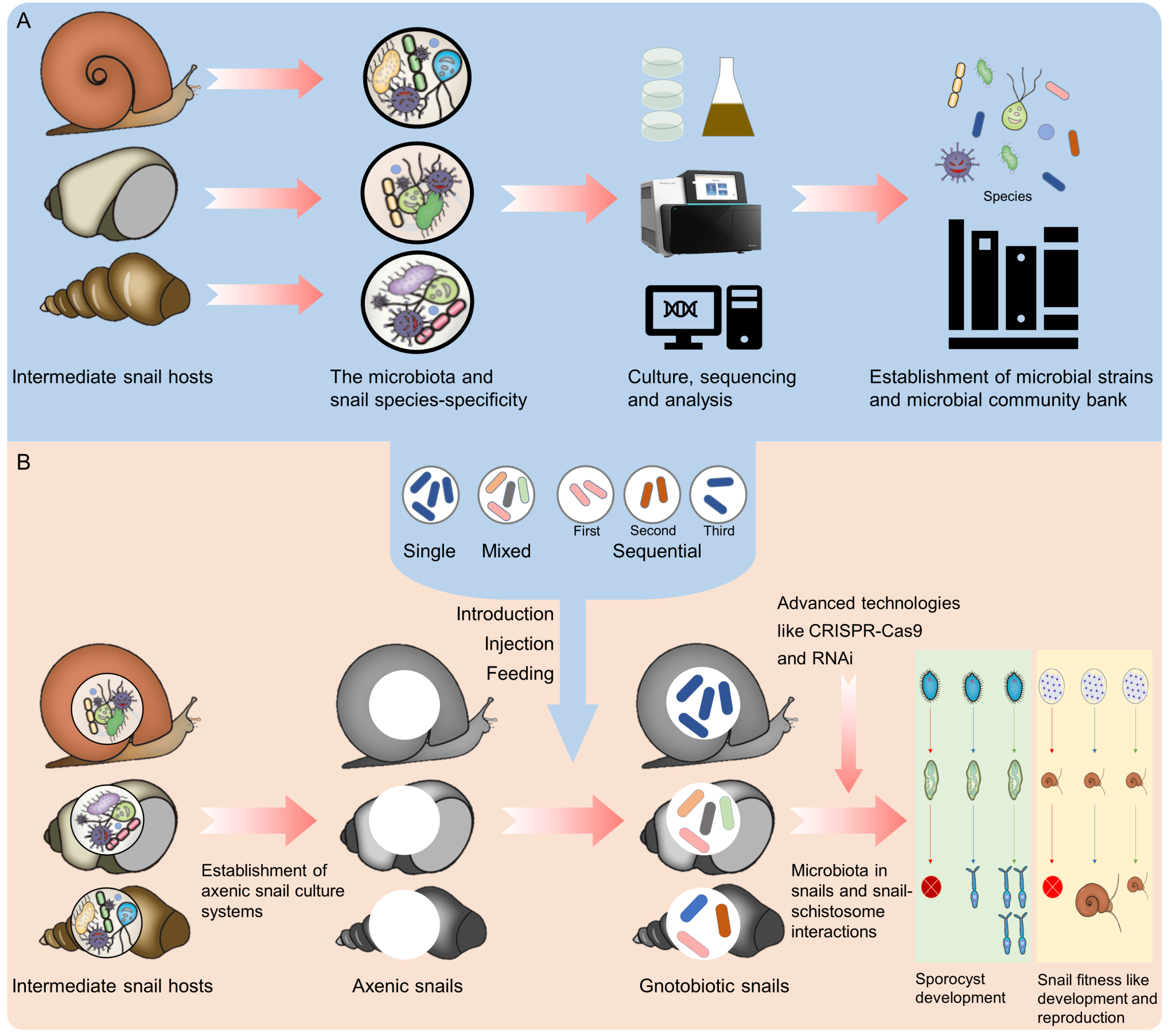 該綜述首先系統(tǒng)總結(jié)了分布在血吸蟲中間宿主不同螺類、不同部位和組織的微生物群落,如全螺微生物群、腸道微生物群、血淋巴微生物群和卵微生物群等等,探討了重要微生物群落對宿主螺類的生物學(xué)特性的影響,特別是在適應(yīng)性、生長發(fā)育和免疫系統(tǒng)調(diào)節(jié)方面。