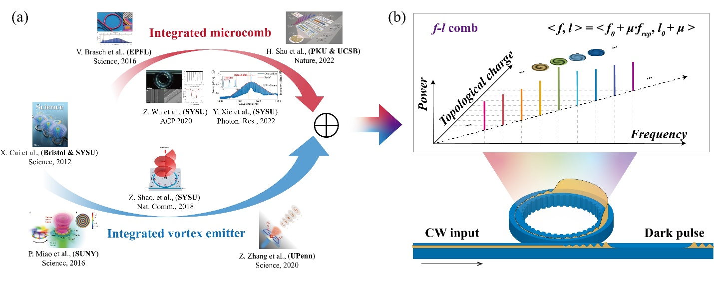 圖1. (a) 2012年以來,在集成渦旋光發射器和集成微腔光頻梳領域取得的重大突破;(b) 在一個帶有側壁光柵的微環諧振腔內產生的相干光學頻率梳(f-l comb)示意圖,每根梳齒都攜帶有不同的OAM拓撲荷。