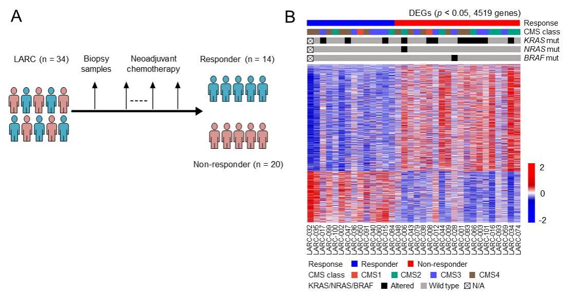 研究團隊通過收集34例新輔助治療前的局部進展期直腸癌患者腫瘤樣本,根據新輔助治療后手術切除的腫瘤樣本病理切片進行腫瘤退縮評價(Tumor regression grade,TRG),對病人進行分類,并分析耐藥相關的腫瘤分子特征(圖2)。