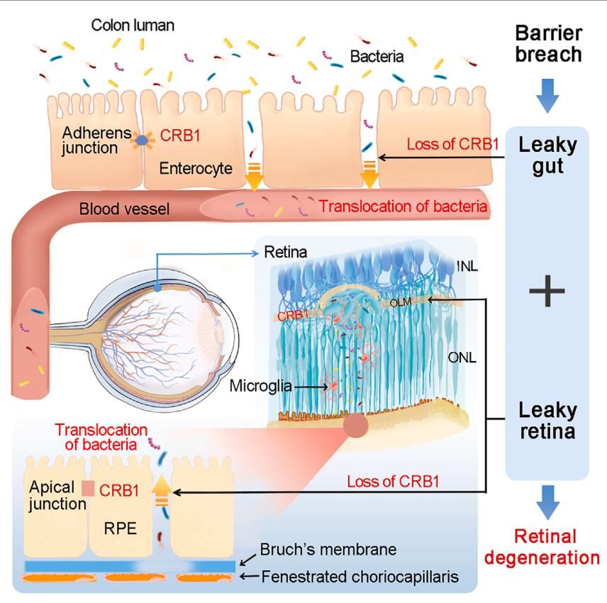 Crb1基因的功能缺失導致腸道屏障結構破壞,促使腸腔內細菌進入血液循環。同時,因Crb1基因的功能缺失導致的視網膜色素上皮細胞間的連接復合體功能缺失,致使外周血內的少量細菌同樣可以經過血視網膜外屏障的破壞處進入視網膜組織內部,造成炎癥和視網膜損傷。