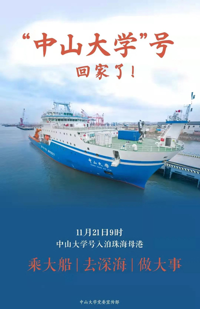 中大新聞網11月22日珠海電(記者李建平、吳立堅)11月21日上午9時整,珠海高欄港烽火海洋碼頭,碧海藍天下,藍白色船體的“中山大學”號在兩條引導船的協助下入泊母港。