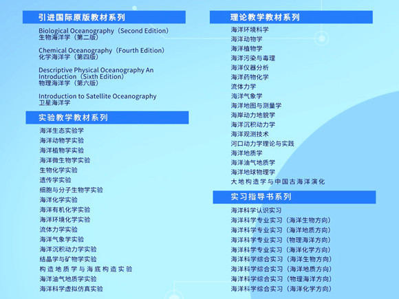 即將出版的教材共14本,分別為:《海洋植物學》《海洋油氣地質學》《海岸動力地貌學》《生物海洋學(第二版)》《海洋生態學實驗》《遺傳學實驗》《海洋地圖與測量學》《流體力學》《海洋污染與毒理》《海洋地質學》《化學專業英語(海洋化學方向)》《海洋科學認識實習》《海洋科學專業實習(物理海洋方向)》《海洋科學綜合實習(物理海洋方向)》。