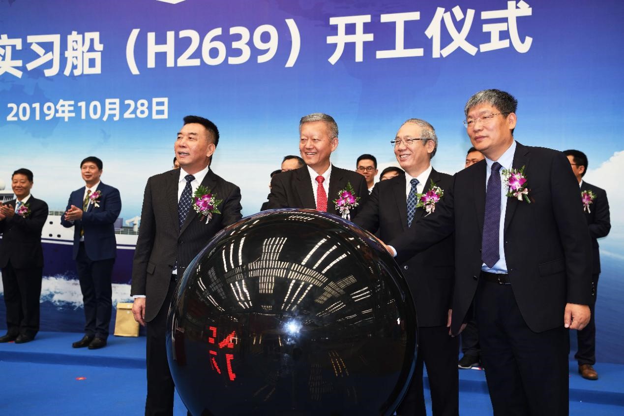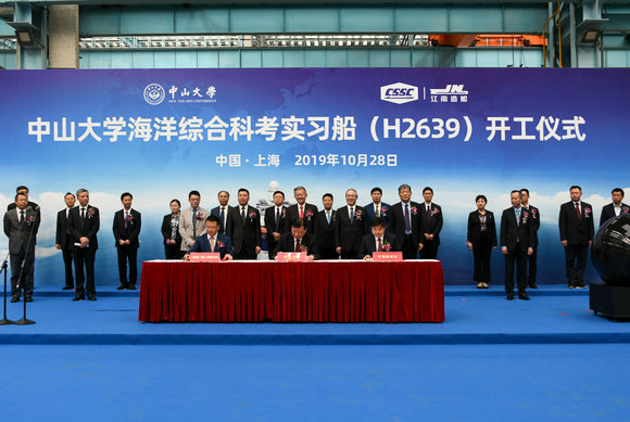 10月28日上午,我校海洋綜合科考實習(xí)船(以下簡稱“中大科考船”)開工儀式在上海長興島江南造船(集團)有限責(zé)任公司(以下簡稱“江南造船”)舉行。我校黨委書記陳春聲、校長羅俊院士、常務(wù)副校長孫冬柏,南方海洋科學(xué)與工程實驗室主任陳大可院士,江南造船黨委書記、董事長林鷗,江南造船總經(jīng)理、黨委副書記黃文飛,中國船級社上海分社副總經(jīng)理徐立,七〇八研究所黨委書記盧霖,上海佳船工程監(jiān)理發(fā)展有限公司負(fù)責(zé)人,以及我校有關(guān)職能部門、涉海院系負(fù)責(zé)人和科考船建設(shè)指揮部成員等60多人出席開工儀式。江南造船副總經(jīng)理林青山主持儀式。